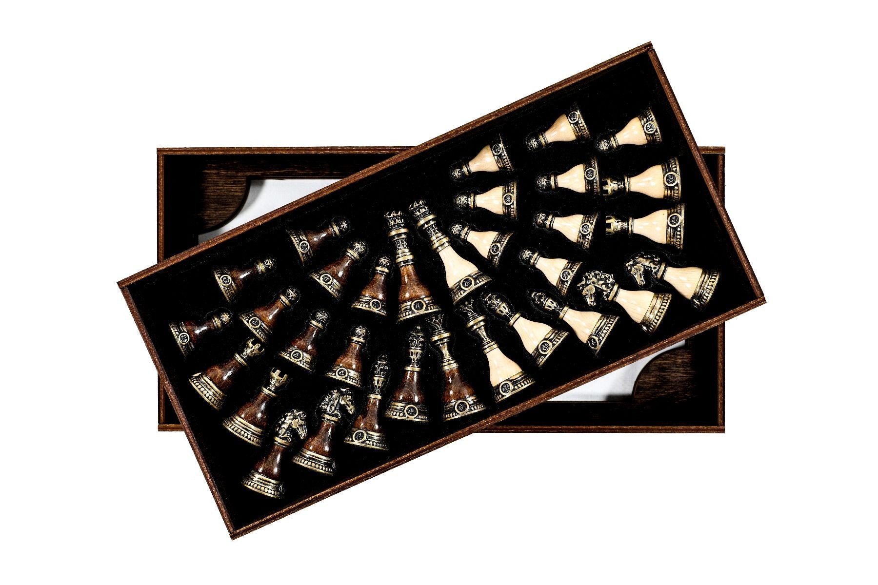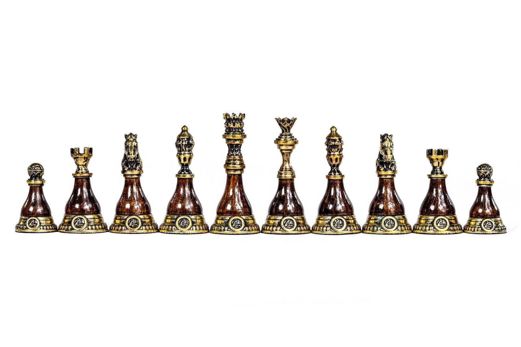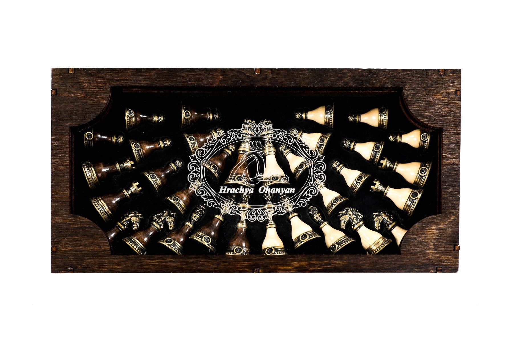 This original chess figure model features a unique combination of bronze and wood (beech tree and walnut tree). Each figure has the Hrachya Ohanyan company logo. The bottom of each piece is covered with velvet fabric.