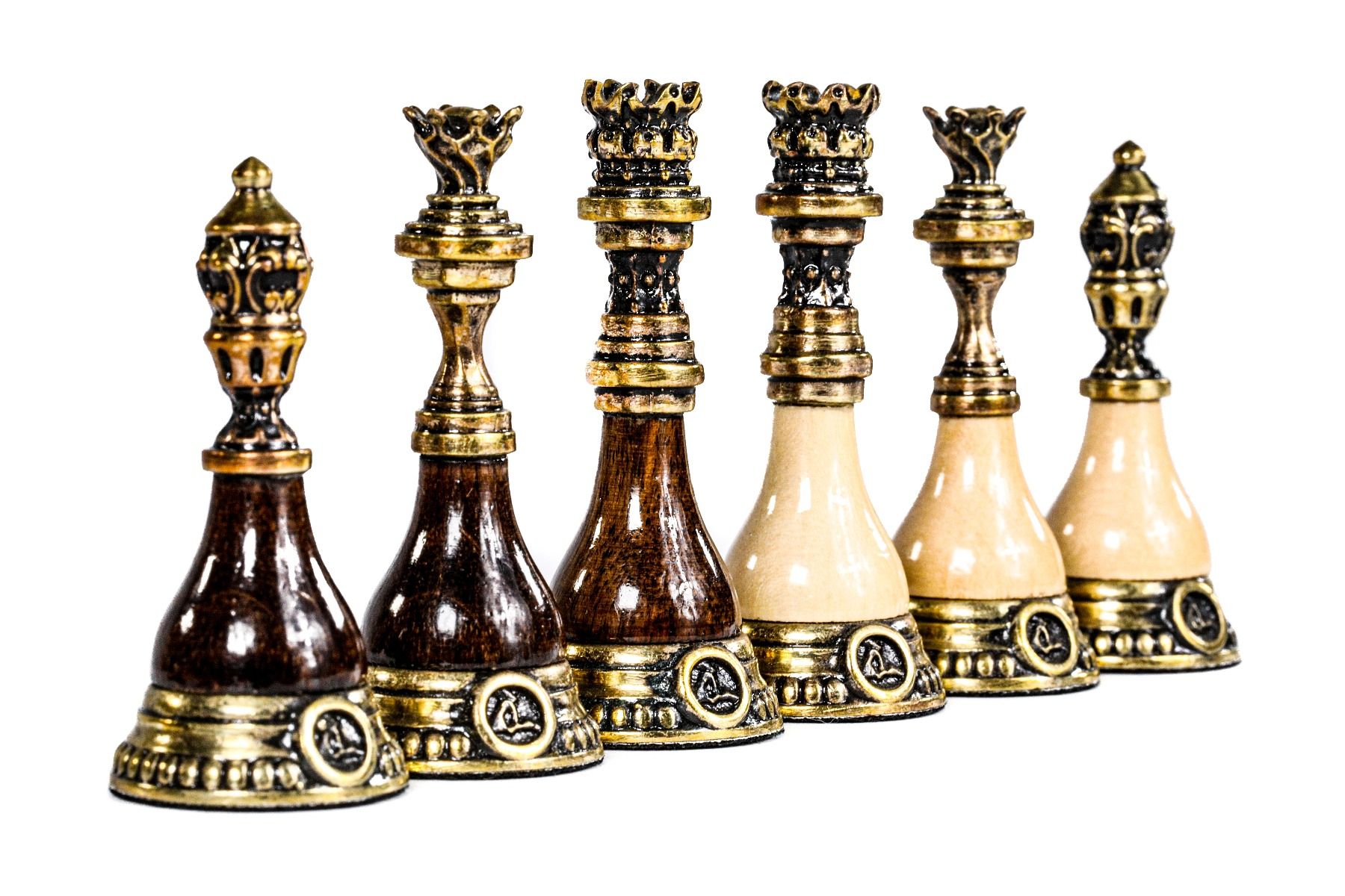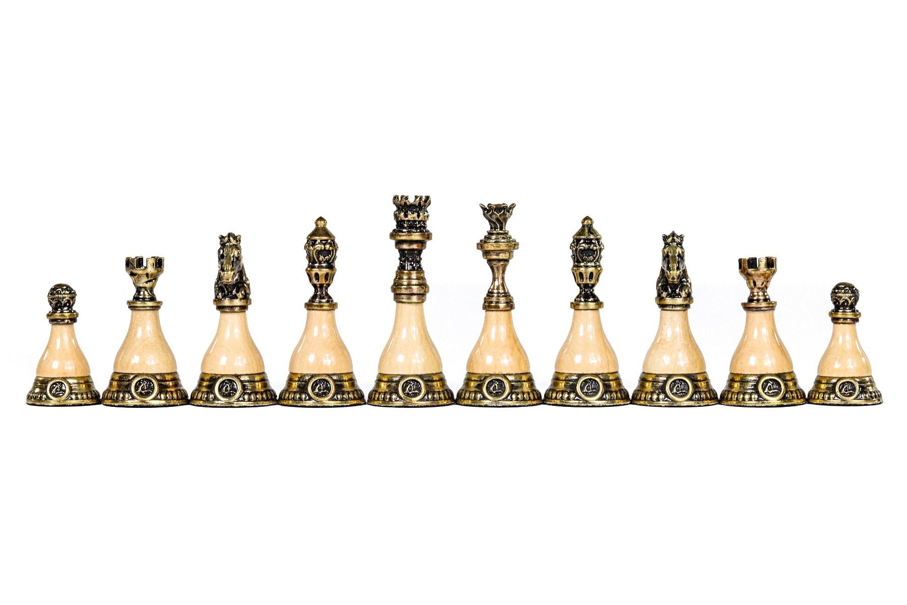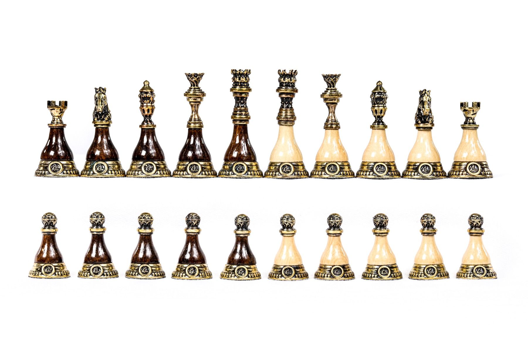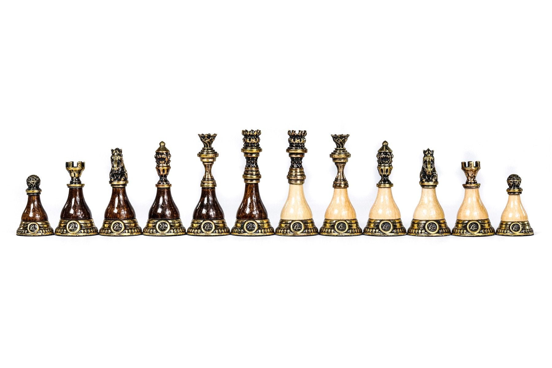 This original chess figure model features a unique combination of bronze and wood (beech tree and walnut tree). Each figure has the Hrachya Ohanyan company logo. The bottom of each piece is covered with velvet fabric.