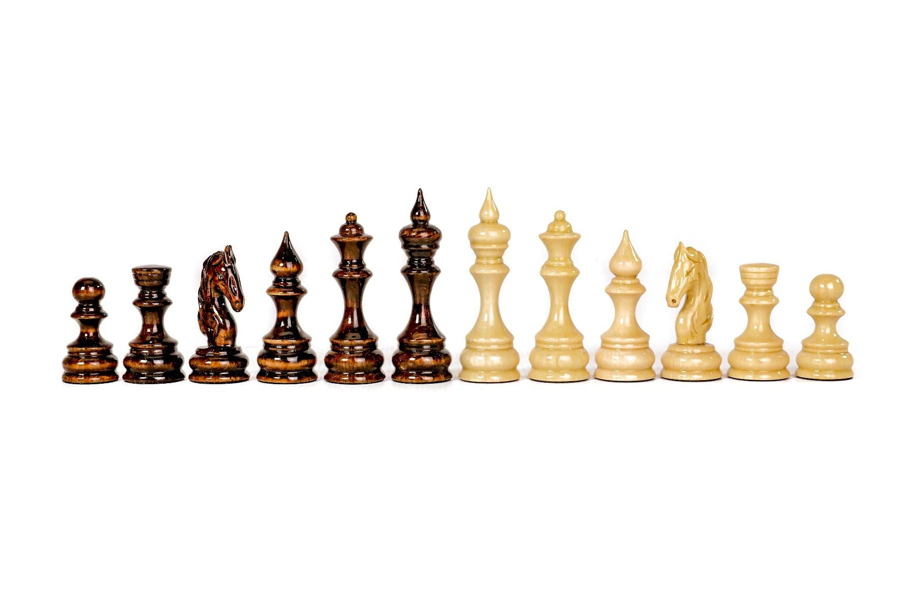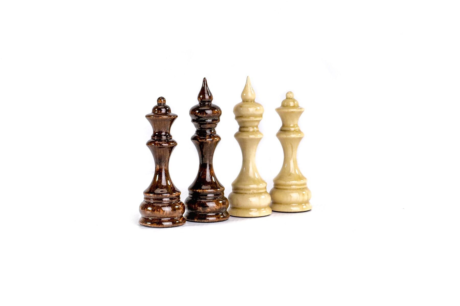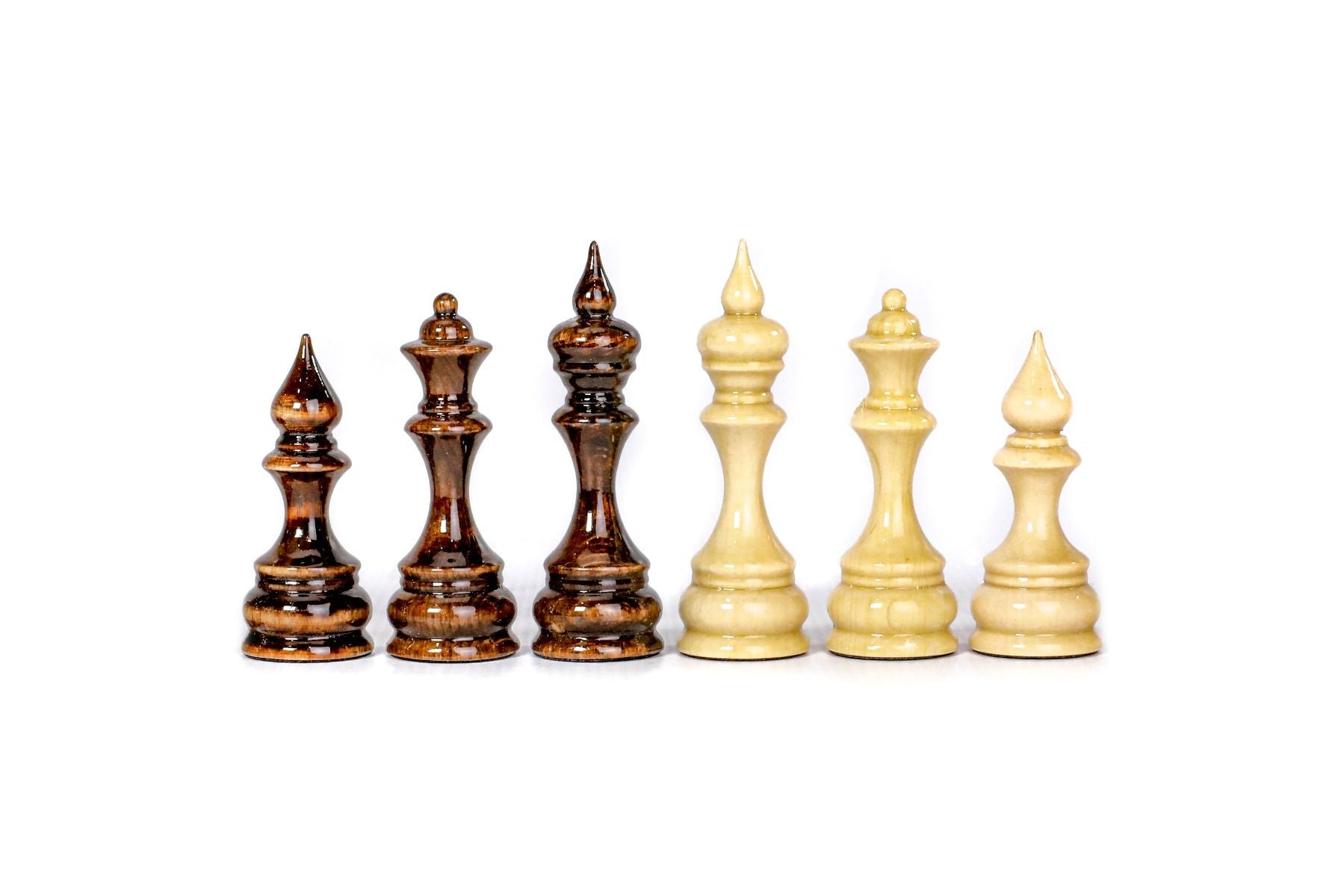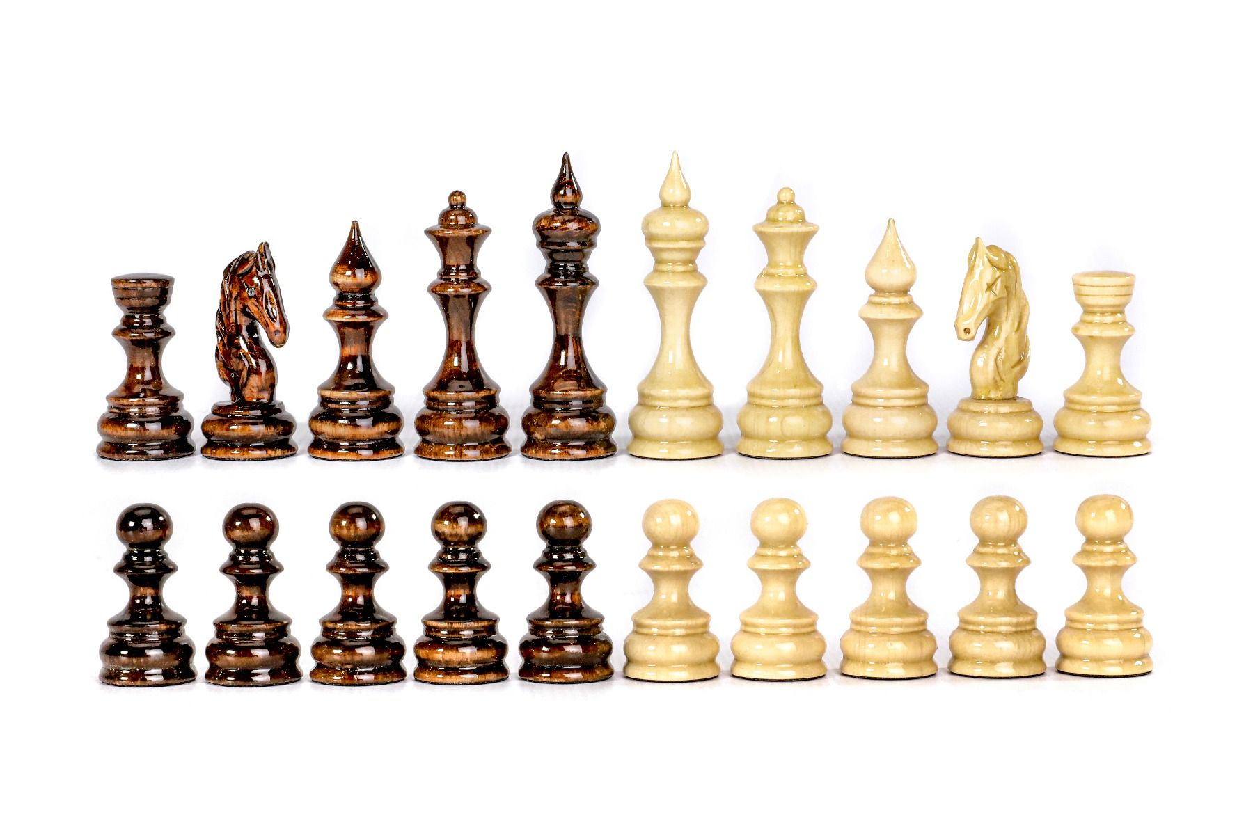 This chess figures are made of beech wood and walnut wood, and the opposite side of each figure is covered with velvet fabric.